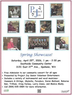 The Project Joy Spring Showcase is a FREE concert that features a variety of talented singers and musician. The concert is Saturday, April 25th at 1 pm at the Southside Community Center. Project Joy is a non-profit organization of Senior Volunteer entertainers who perform at care centers, assisted living facilities, memory care, independent living facilities, churches, and schools. Come join us for an afternoon of enjoyable entertainment.