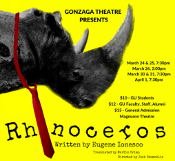 Translated by Martin Crimp and directed by guest artist Josh Stamoolis, Gonzaga University's Spring 2023 theatre mainstage is Eugene Ionesco's 1959 masterwork, Rhinoceros! A meditation, among others, on the spread of dangerous ideologies and baseless beliefs, the denizens of a small provincial town begin turning, one by one--to the increasing alarm of our protagonist--into rampaging pachyderms. Join us as we explore this classic midcentury play that remains absurdly funny and rings shockingly fresh.