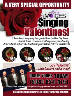 Lilac City Voices will sing two classic Valentine songs, in person, delivering a choice of five floral arrangements from Peter’s and Sons FTD florist, to homes, businesses, schools, restaurants, hospitals, retirement and nursing homes in Spokane. Call (509) 624-4151 to order now for delivery on February 13 or 14.