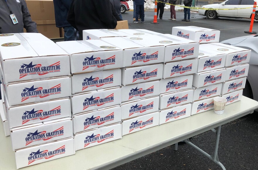 Appreciative for packages bestowed upon them: boxes of food from Second Harvest, supplies from Operation Gratitude, bags from the Red Cross, given out by volunteers such as Deb Davis.
