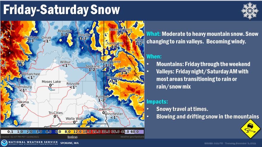Friday will be cloudy and generally dry in much of the Inland Northwest with a chance of snow flurries, increasing in the afternoon, leading to heavier snow falling in the evening and overnight. Snow or a snow/rain mix will continue periodically through the weekend. Forecasters expect the Spokane/Coeur d’Alene area to receive between one and three inches overall.