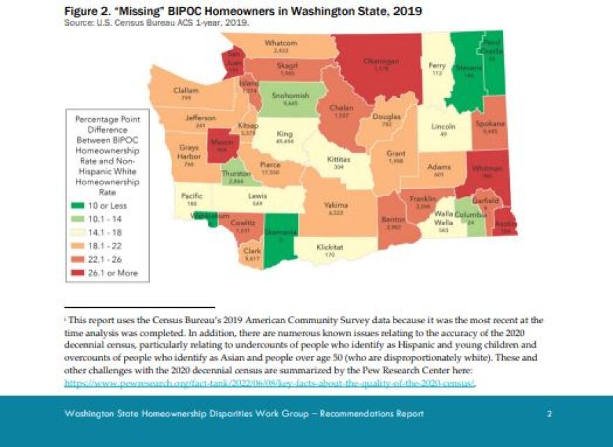 The counties with the largest home ownership gaps include Mason, San Juan, Okanogan and Whitman Counties. Spokane, Benton and Franklin counties also have significant disparities.